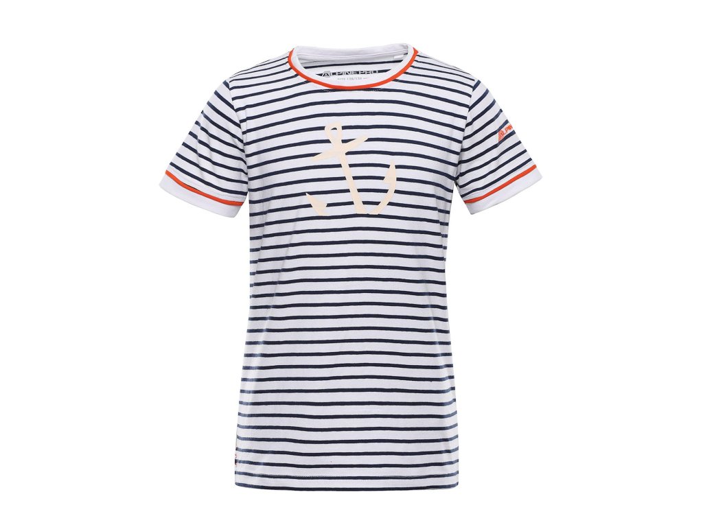 Dětské bavlněné triko NAMORO je ideální volbou pro kluky i holky na léto, volný čas i lehké sportovní aktivity. Pružný vyplétaný materiál poskytuje maximální komfort a volnost pohybu po celý den. Polopřiléhavý střih dobře padne a zajišťuje pohodlné nošení, zatímco moderní pruhovaný námořní styl dodává triku hravý a letní vzhled. Efektní potisk reagující na denní svit je umístěn na předním dílu a rukávu, což z trika dělá originální kousek, který děti rády nosí. NAMORO spojuje pohodlí, styl a praktické vlastnosti pro každodenní nošení i letní dobrodružství.