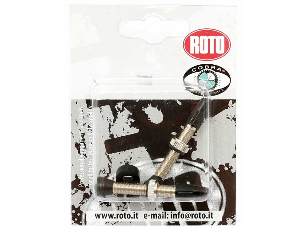 Sada galuskových ventilků ROTO pro bezdušové systémy s demontovatelným vnitřním tělem. Gumová kuželová koncovka dobře vystředí a utěsní místo okolo ventilku.Dělka ventilku: 40 mm