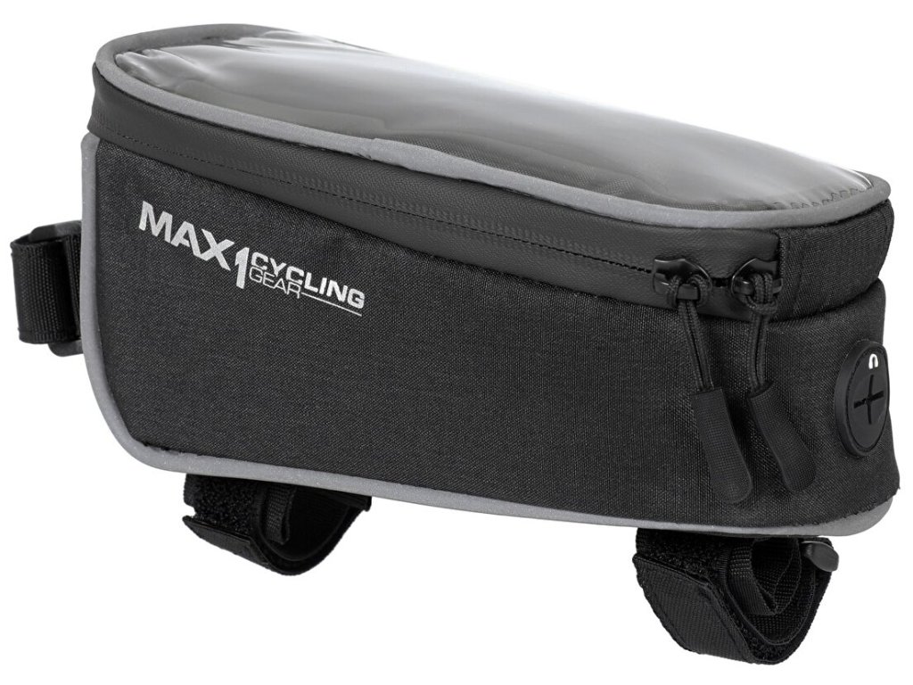 Kompaktní brašna MAX1 na rámovou trubku s kapsou uzpůsobenou pro mobilní telefon.Gumová membrána pro umístění sluchátek ve spodní části brašny. Pasuje na většinu standardních rámů.