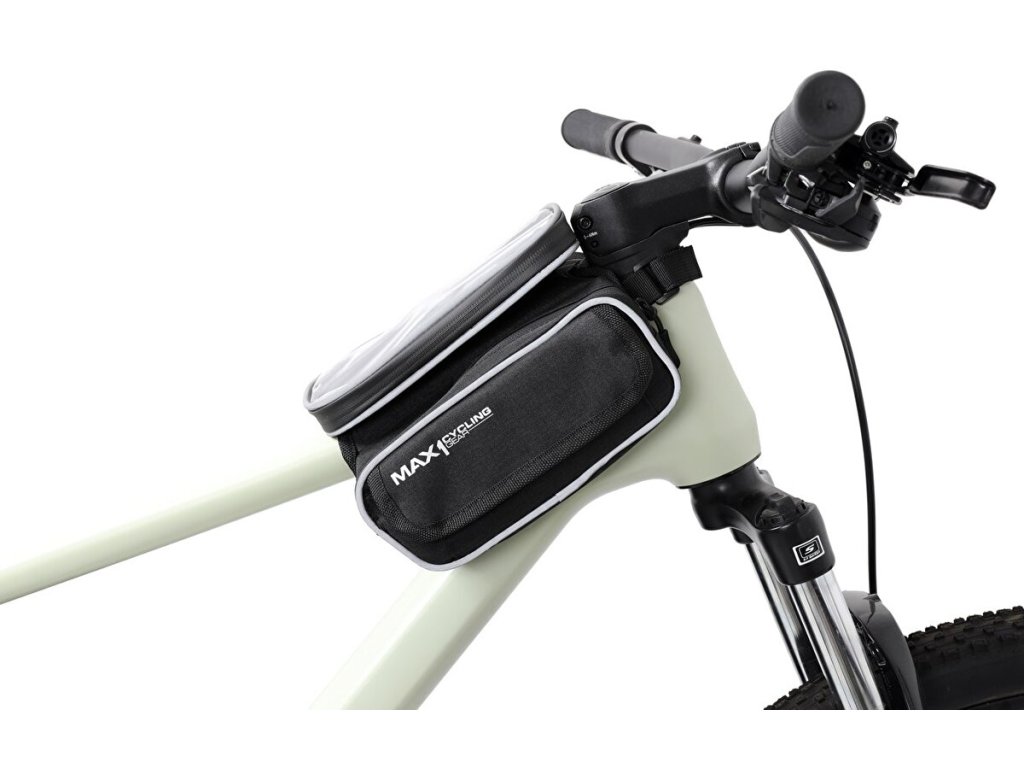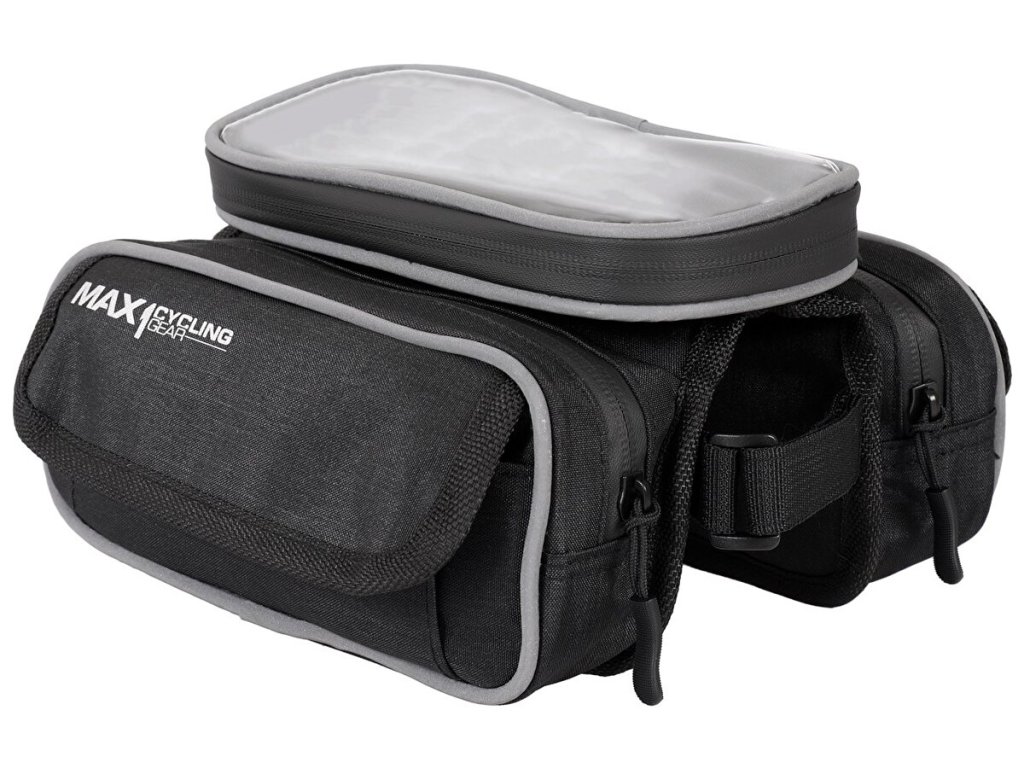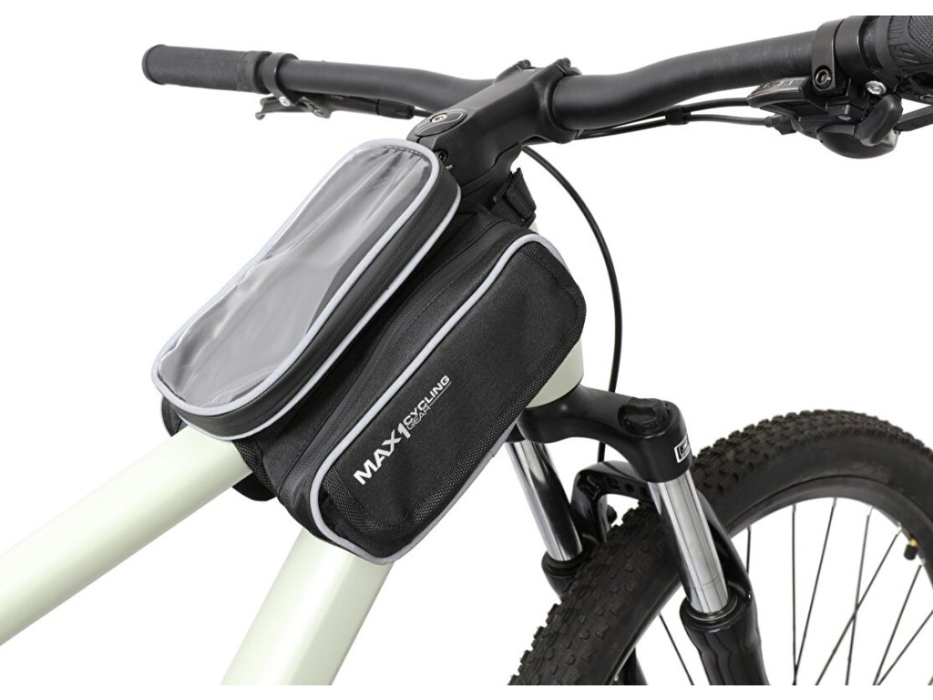 Inovovaná dvojitá brašna MAX1 Two Evo na rámovou trubku s odnímatelnou kapsou uzpůsobenou pro větší mobilní telefon.Gumová membrána pro umístění sluchátek ve spodní části brašny.