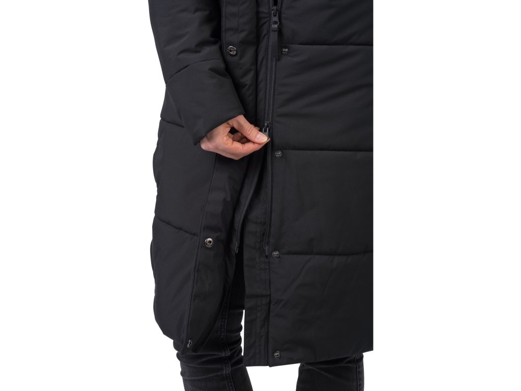 Kabát má zateplený límec s kapucí se stahováním, dvě zateplené hlavní kapsy na zip a hlavní zip krytý légou. Dekorativním i funkčním prvkem jsou boční rozparky na patenty. Rukávy jsou zakončeny vnitřní elastickou manžetou, která zamezuje úniku chladu.