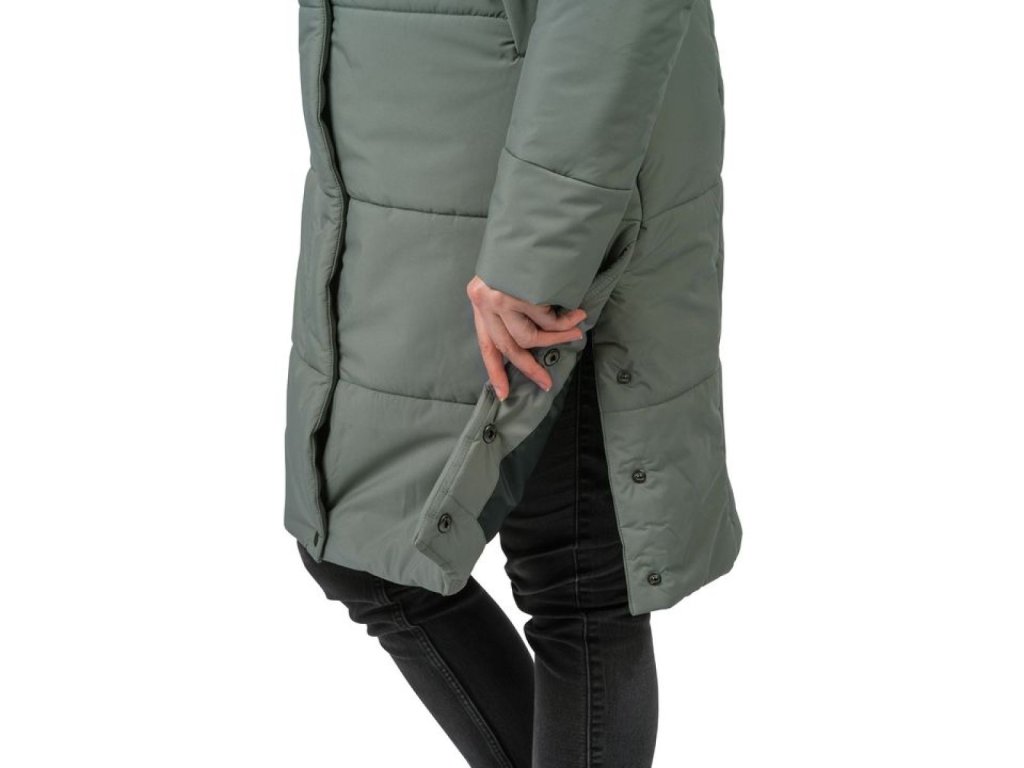 Kabát má zateplený límec s kapucí se stahováním, dvě zateplené hlavní kapsy na zip a hlavní zip krytý légou. Dekorativním i funkčním prvkem jsou boční rozparky na patenty. Rukávy jsou zakončeny vnitřní elastickou manžetou, která zamezuje úniku chladu.