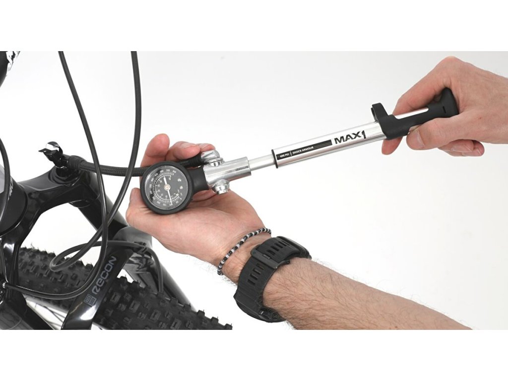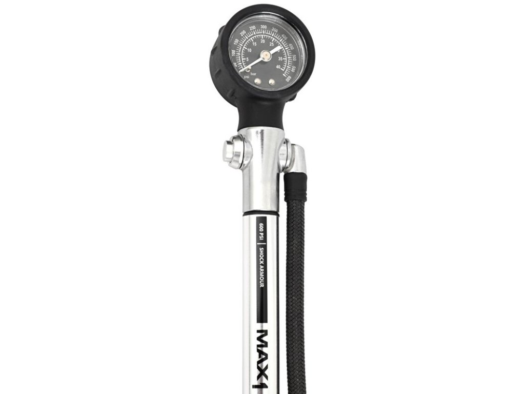 Extrémní hustilka MAX1 Shock Armour na tlumiče/odpružené vidlice/teleskopické sedlovky do maximálního tlaku 600 psi. Je vybavena opletenou hadicí, upouštěcím ventilem, díky kterému můžete velice citlivě nastavovat požadované tlaky. Přesný a přehledný manometr měří tlak v jednotkách bar a psi.Specifikace: