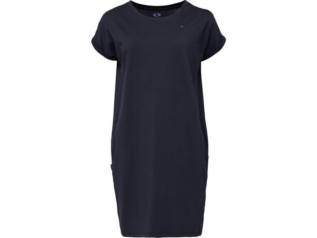 Dámské šaty volnějšího střihu s krátkým rukávem. Mají kapsy na bocích a na předním díle kontrastní potisk. Jsou v délce nad kolena. Šaty jsou vyrobené z příjemného bavlněného materiálu.