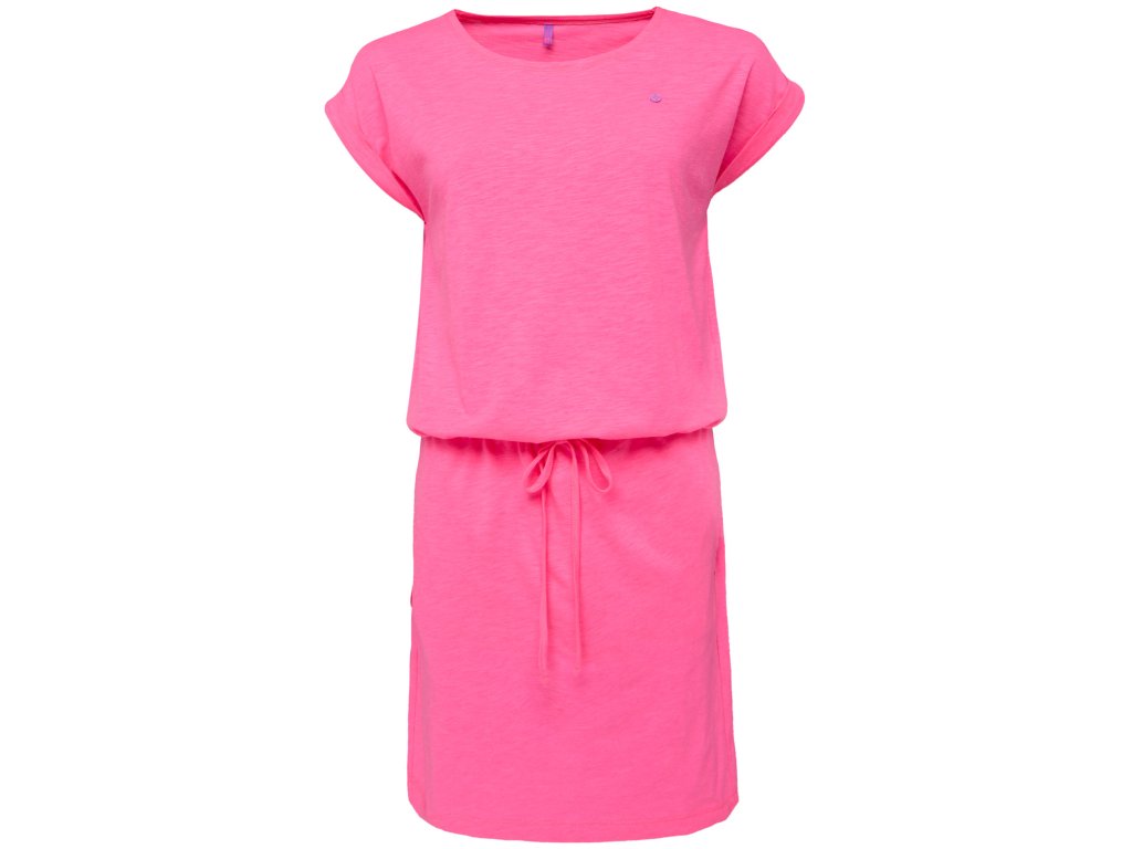Dámské šaty volnějšího střihu s krátkým rukávem. Mají kapsy na bocích a na předním díle kontrastní potisk. Jsou v délce nad kolena. Šaty jsou vyrobené z příjemného bavlněného materiálu.
