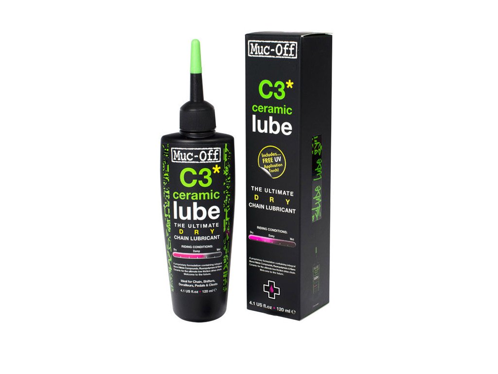 Muc Off C3 Ceramic Lube Dry 120ml- patentované složení založené na sloučenině nitridu boru, fluoropolymerech a nano keramických aditivech zajišťujících velmi nízkou frikci
