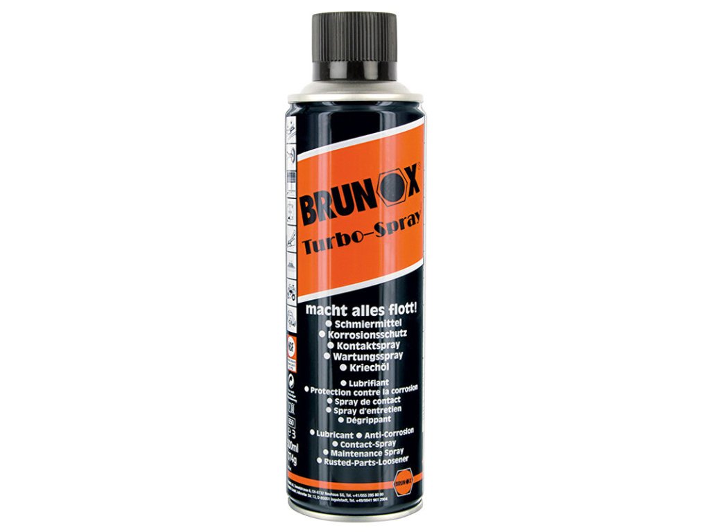 Brunox Turbo Sprej - antikorozní, mazací, čistící a konzervační prostředek na bázi uhlovodanůs aditivem Turboline. Má výtečnou viskozitu, dokáže proniknout do jemných vlasových trhlin