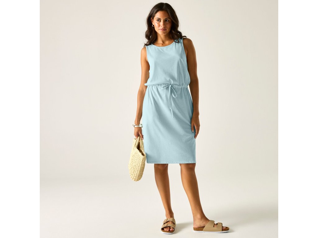 Přiléhavé dámské šaty sportovního typu. Mají širší ramínka a na předním díle je potisk. Šaty mají délku nad kolena. Jsou vyrobené z bavlněného materiálu.