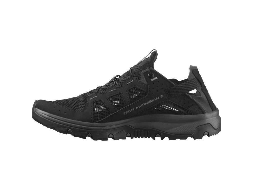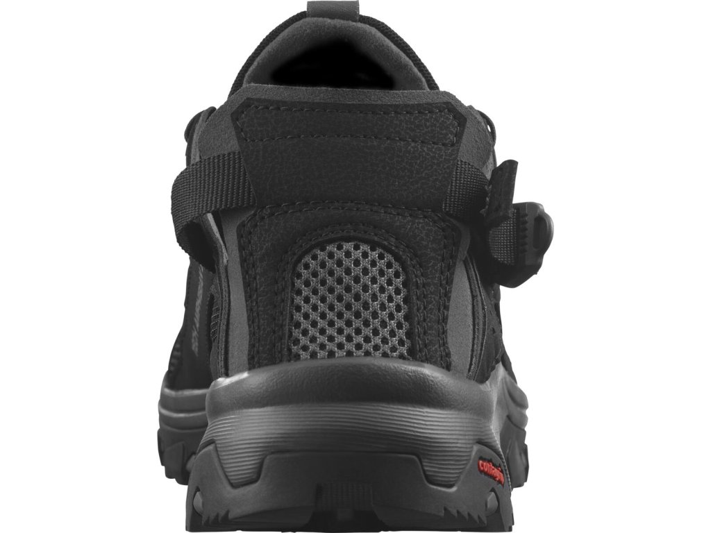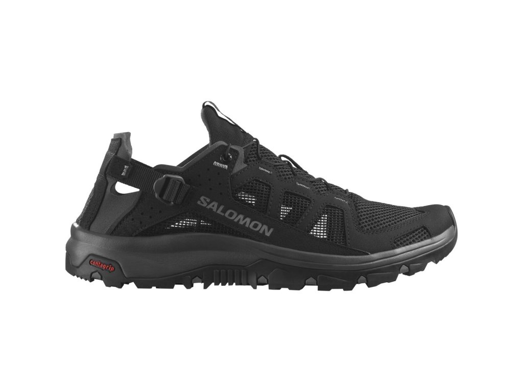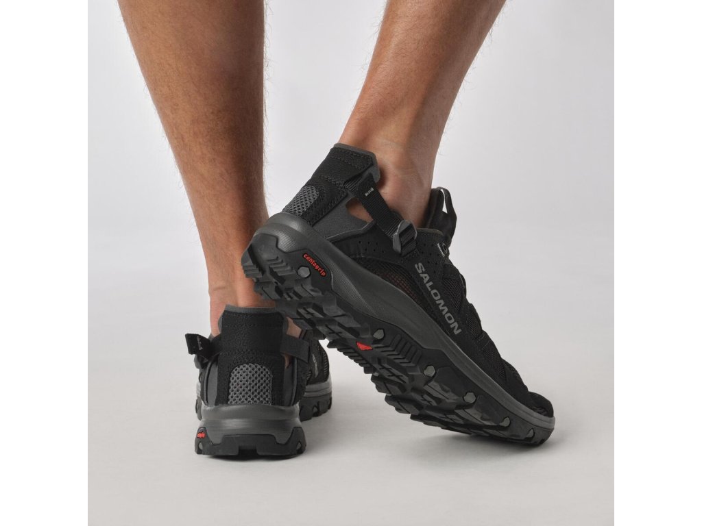 Legendární pánské sandály Salomon Techamphibian 5 v novém přepracování dostaly měkčí stélku a vylepšený jazyk. Nabídnou vám tak ještě větší pohodlí, ať už tyto univerzální sandály obujete kamkoliv. Svršek tvoří rychleschnoucí prodyšná síťovina s úpravou Anti-debris, která chrání před vniknutím nečistot a kamínků dovnitř obuvi a je také velmi odolná proti oděru. Výbornou přilnavost i ve vodě na mokrých kamenech zajistí podešev Contagrip® FD se speciálním vzorkem. O maximální tlumení nárazů při došlapu a anatomickou podporu nohy se stará EVA pěna, z níž je vyroben také jazyk, což přináší lepší prodyšnost a především eliminuje odřeniny. Technologie SensiFit™ pevně obepne chodidlo a nabízí tak lepší stabilitu nohy. Nechybí rychlošněrování Quicklace™ s kapsičkou na uschování šňůrky a pohodlné nastavení přímo na vaši nohu díky pásku v patní části. I s ochranou špičky tyto pohodlné univerzální sandály váží pouhých 618 gramů.