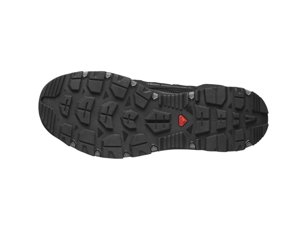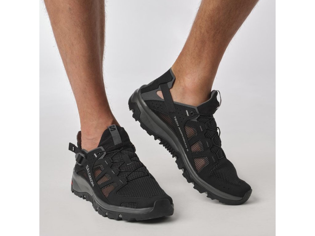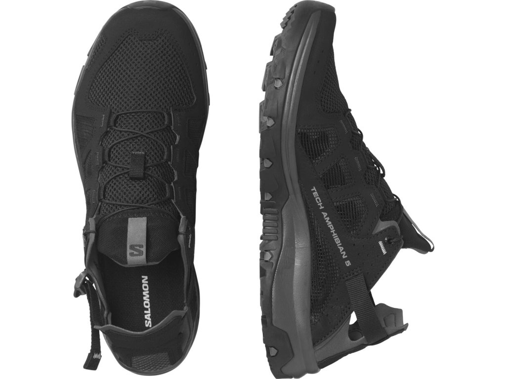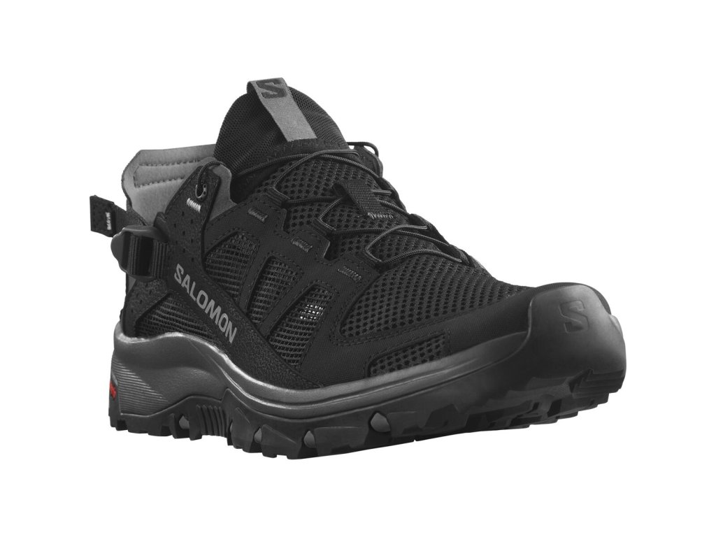Legendární pánské sandály Salomon Techamphibian 5 v novém přepracování dostaly měkčí stélku a vylepšený jazyk. Nabídnou vám tak ještě větší pohodlí, ať už tyto univerzální sandály obujete kamkoliv. Svršek tvoří rychleschnoucí prodyšná síťovina s úpravou Anti-debris, která chrání před vniknutím nečistot a kamínků dovnitř obuvi a je také velmi odolná proti oděru. Výbornou přilnavost i ve vodě na mokrých kamenech zajistí podešev Contagrip® FD se speciálním vzorkem. O maximální tlumení nárazů při došlapu a anatomickou podporu nohy se stará EVA pěna, z níž je vyroben také jazyk, což přináší lepší prodyšnost a především eliminuje odřeniny. Technologie SensiFit™ pevně obepne chodidlo a nabízí tak lepší stabilitu nohy. Nechybí rychlošněrování Quicklace™ s kapsičkou na uschování šňůrky a pohodlné nastavení přímo na vaši nohu díky pásku v patní části. I s ochranou špičky tyto pohodlné univerzální sandály váží pouhých 618 gramů.