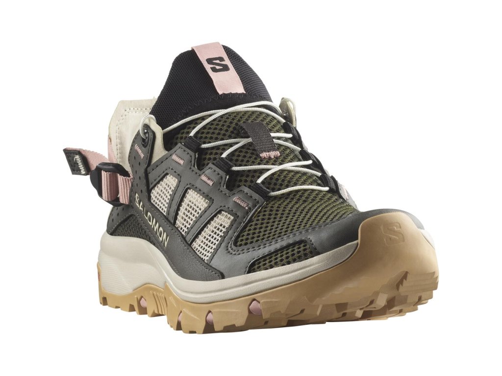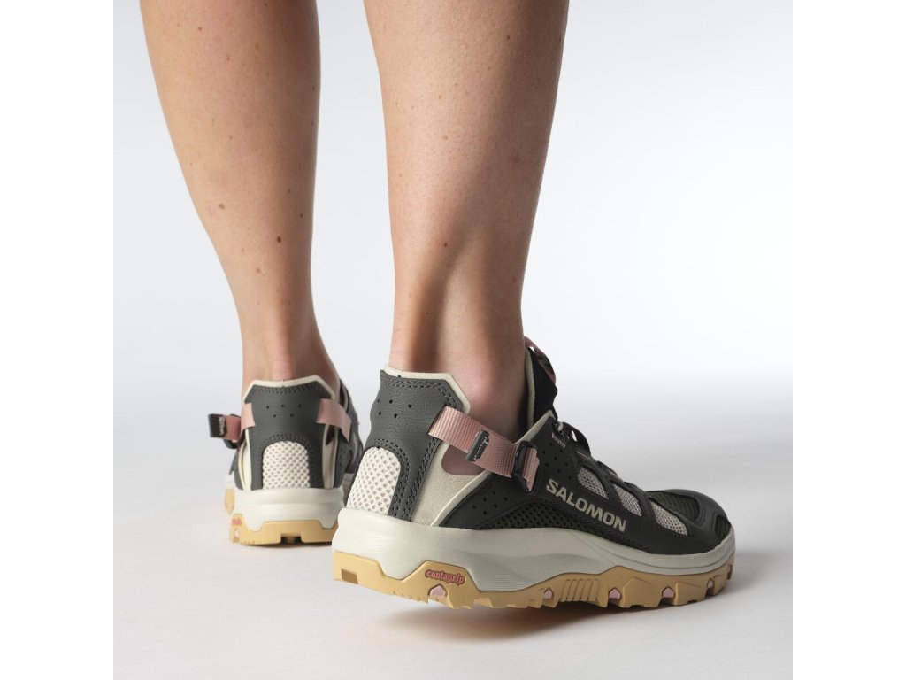 Legendární dámské sandály Salomon Techamphibian 5 v novém přepracování dostaly měkčí stélku a vylepšený jazyk. Nabídnou vám tak ještě větší pohodlí, ať už tyto univerzální sandály obujete kamkoliv. Svršek tvoří rychleschnoucí prodyšná síťovina s úpravou Anti-debris, která chrání před vniknutím nečistot a kamínků dovnitř obuvi a je také velmi odolná proti oděru. Výbornou přilnavost i ve vodě na mokrých kamenech zajistí podešev Contagrip® FD se speciálním vzorkem. O maximální tlumení nárazů při došlapu a anatomickou podporu nohy se stará EVA pěna, z níž je vyroben také jazyk, což přináší lepší prodyšnost a především eliminuje odřeniny. Technologie SensiFit™ pevně obepne chodidlo a nabízí tak lepší stabilitu nohy. Nechybí rychlošněrování Quicklace™ s kapsičkou na uschování šňůrky a pohodlné nastavení přímo na vaši nohu díky pásku v patní části. I s ochranou špičky tyto pohodlné univerzální sandály váží pouhých 618 gramů.