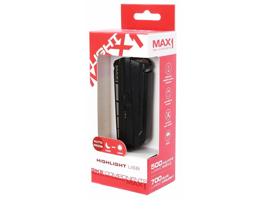 Výkonné přední světlo na řidítka MAX1 Highlight s dobíjením přes USB s vestavěným akumulátorem.Technické parametry: