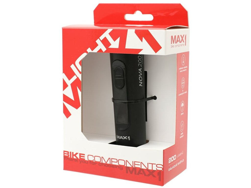 Extra výkonné dobíjecí přední světlo MAX1 Nova 200 s vysokým světelným výkonem 200 lumenů. Díky pružnému gumovému popruhu světlo snadno přiděláte na každá řidítka.Technické parametry: