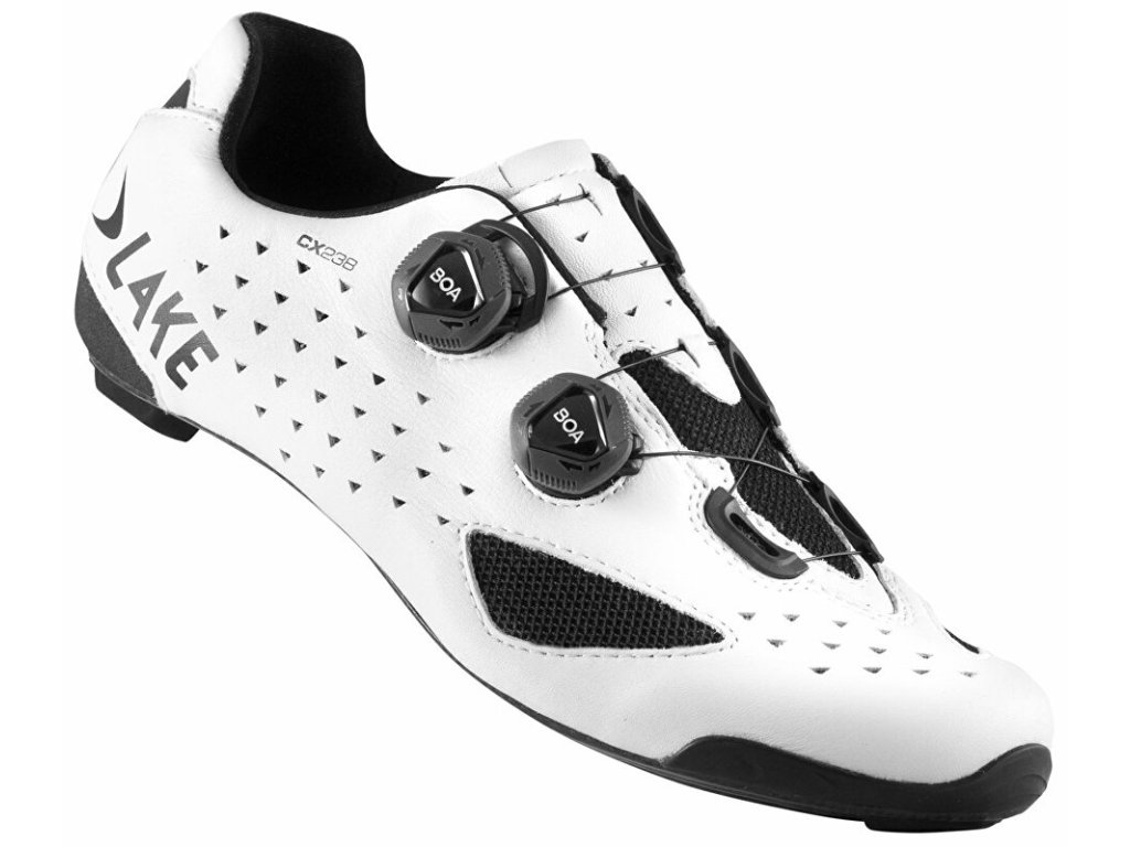 Závodní silniční tretry LAKE CX238 s dvěma upínacími systémy BOA a 100% karbonovou podrážkou Lake Race zajišťující požadovanou tuhost s optimálním přenosem síly na pedál. Svršek modelu je vyroben z kvalitní kůže s dlouhou životností zachovávající si vysokou prodyšnost a voděodolnost. V oblasti paty byl použit jednosměrný fleece zabraňující vyzouvání, který napomáhá udržet nohu na svém místě a předchází nechtěnému pohybu nohy v tretře.Svršek