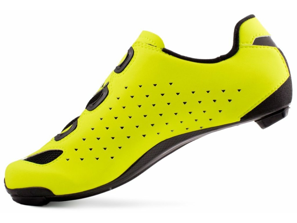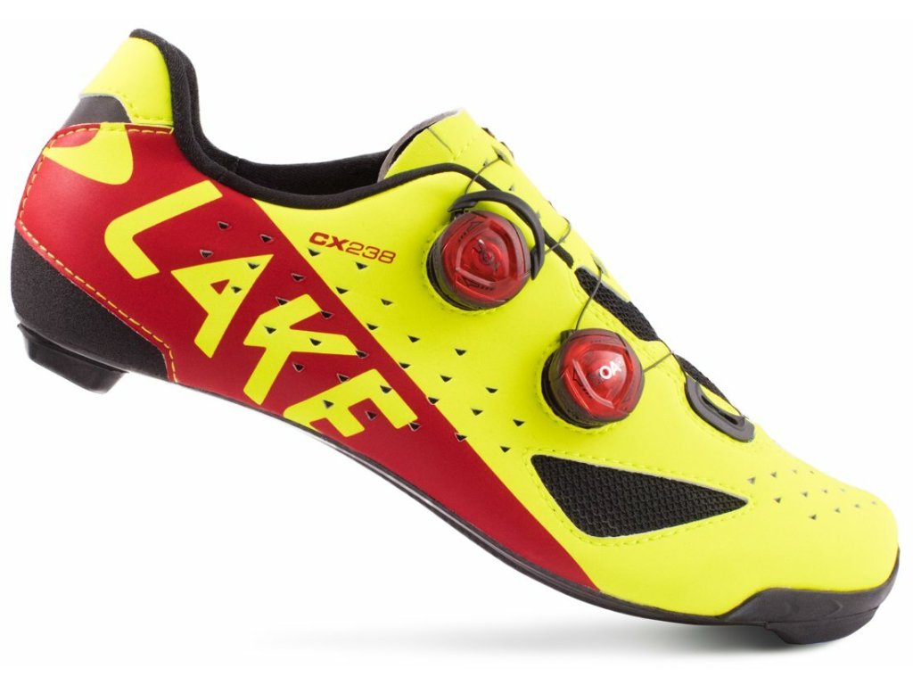 Závodní silniční tretry LAKE CX238 s dvěma upínacími systémy BOA a 100% karbonovou podrážkou Lake Race zajišťující požadovanou tuhost s optimálním přenosem síly na pedál. Svršek modelu je vyroben z Clarino Microfiber v kombinaci s kůží s povrchovou úpravou Helcor se zvýšenou odolností proti odření na exponovaných místech. V oblasti paty byl použit jednosměrný fleece zabraňující vyzouvání, který napomáhá udržet nohu na svém místě a předchází nechtěnému pohybu nohy v tretře.Svršek