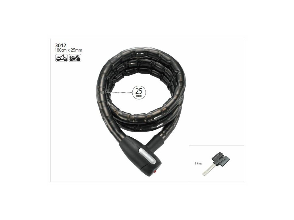 Tuhé ocelové lano je kryto hliníkovými články a tvrdým ochraným plastem a bezpečnostní hlavou, délka 1800mm a průměr 25mm, 5 klíčů. Hmotnost 1350 g.Zámky MAGNUM mají tradici již od roku 1964 a využívají celou řadu vlastních patentů.